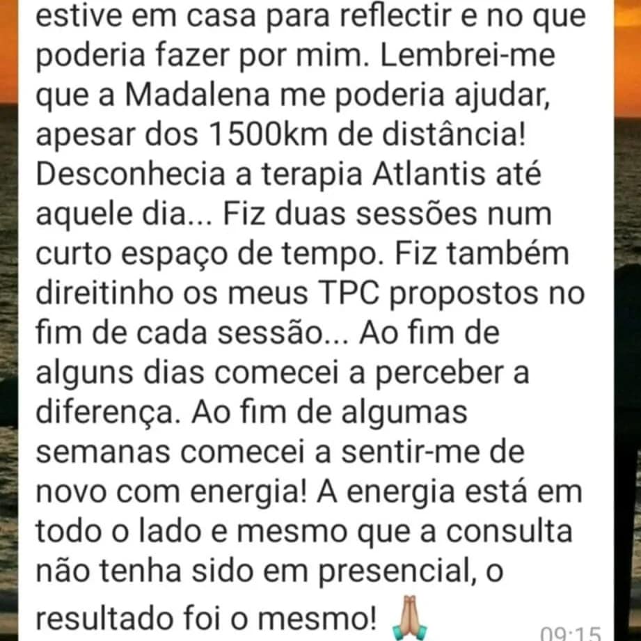 Um depoimento que partilho com muito carinho, e que revela a eficácia e eficiência de uma das terapias que facilito há 9 anos, e também à distância, a Terapia Quântica Multidimensional Atlantis. A Terapia do coração para o coração pelo coração, já com uma série de inovações adaptadas a cada Humano. Hoje e nos próximos dias, continuarei esta missão no presencial e também no online através das tecnologias que temos ao dispor, e constato que os resultados são abismais.