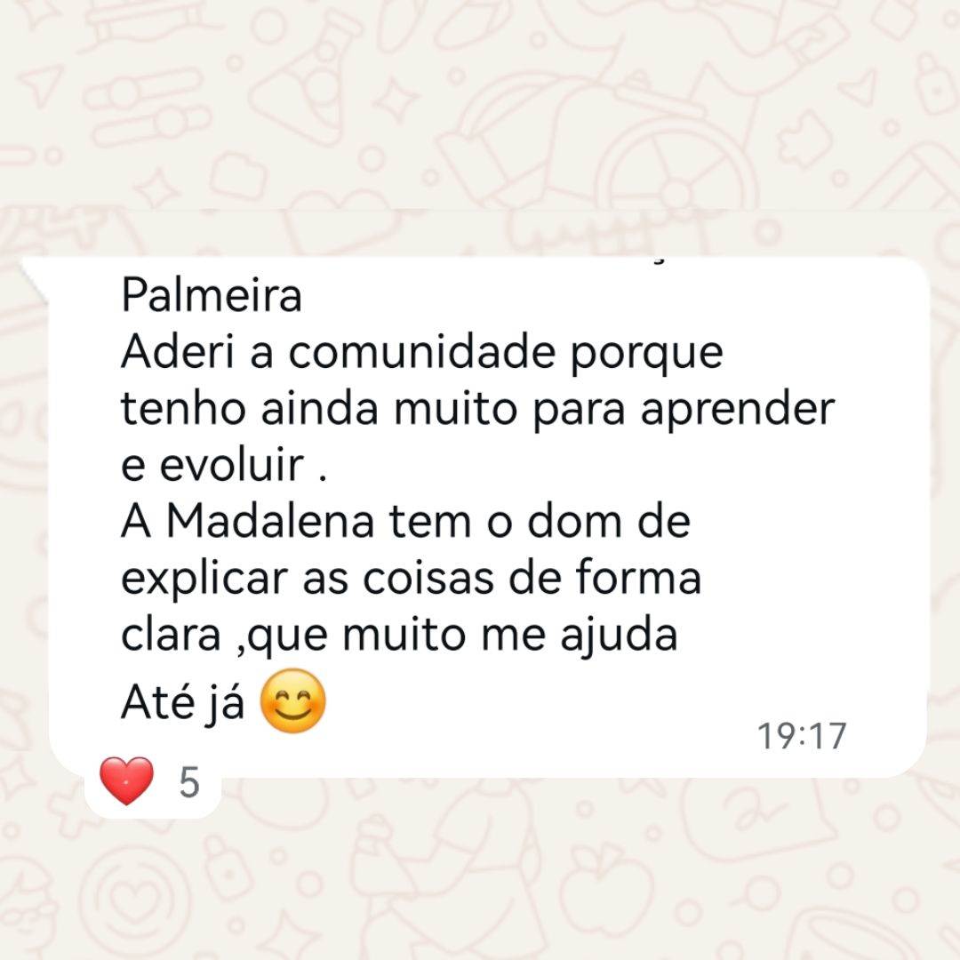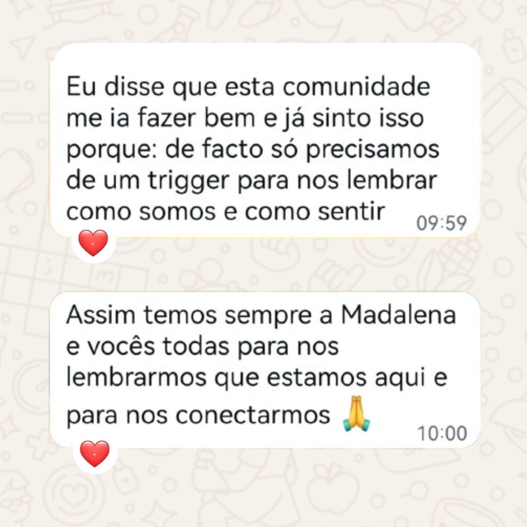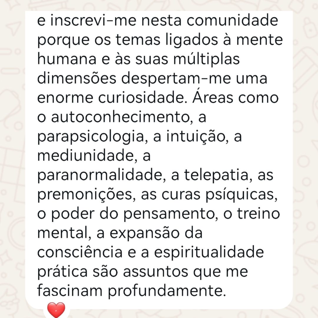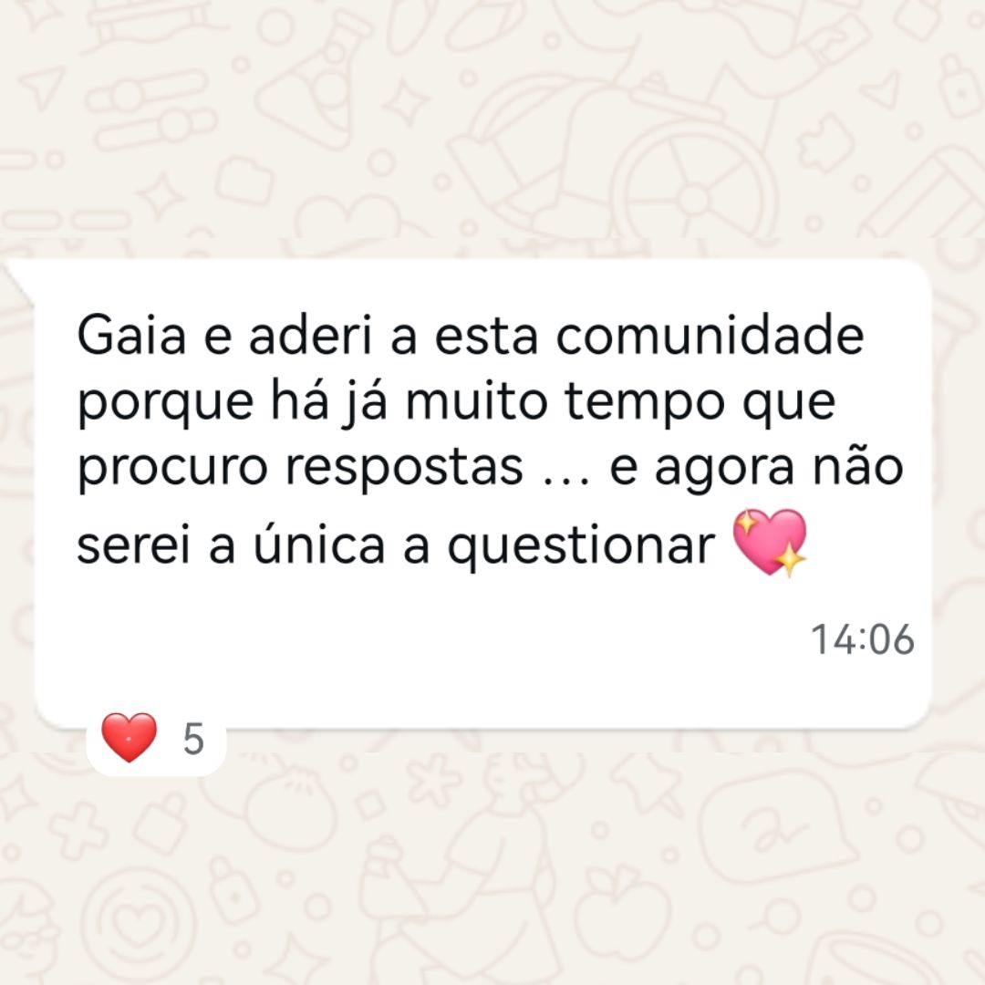 A Comunidade foi pensada para te acompanhar com leveza, profundidade e continuidade. Ao entrares, escolhes fazer parte de um grupo que valoriza a sensibilidade, a espiritualidade no dia a dia e o desenvolvimento do potencial mental com equilíbrio.